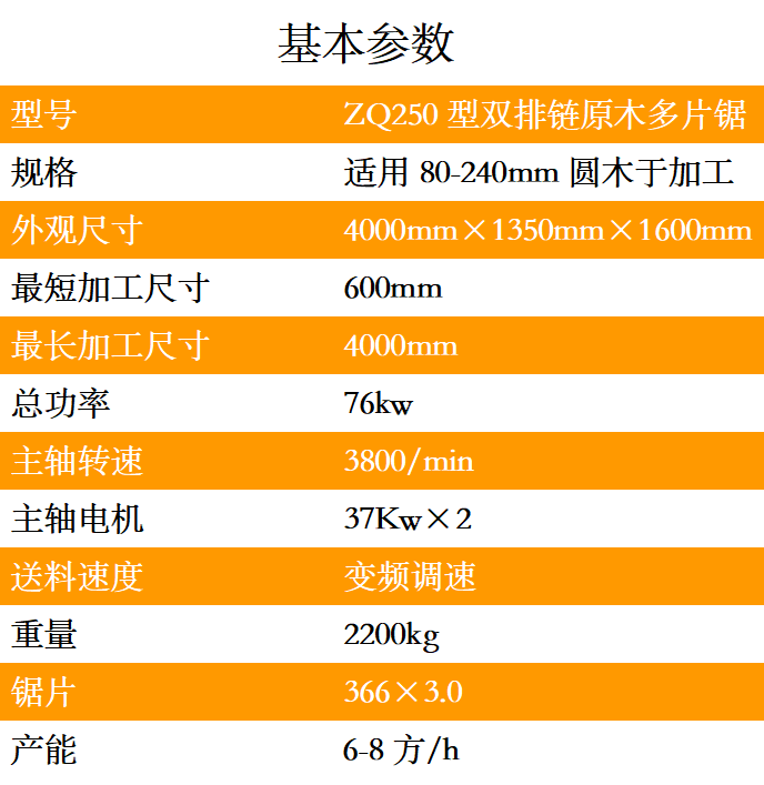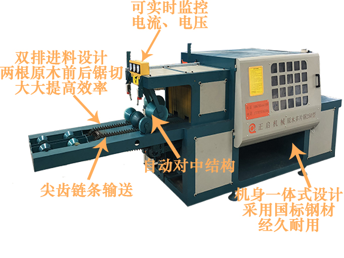 ZQ250型雙排鏈原木多片鋸是針對原木鋸切而設計的專用機床,采用五軸結構設計-前鋸后導航確保木板的精確度,無論木板長短均可保證鋸切木材尺寸公差在0.2mm-0.5mm之內,尺寸標準偏差小,節約木料,上下鋸軸,鋸片采用進口帶刮刀鋸片,鋸切表面光滑,無需再刨,保證不燒鋸片。采用自動分中裝置,提高木材的利用率;上壓輥主動增加壓力,送料平穩;軸心噴水冷卻鋸片,去脂降溫,增強鋸片的使用壽命。一次多片,大大提高工效;