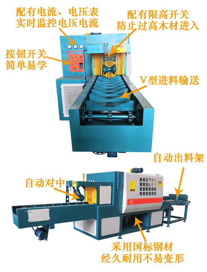 送 料:采用優(yōu)質鏈條輸送,機上配有的變頻智能調速器,可以對大小木料的進料速度實行自由調速。原木可以實現(xiàn)自動分中,機上還配有限位開關,防止超去規(guī)格木料進入,防止卡木避免對機器造成損壞。