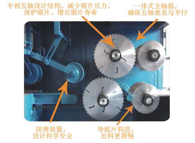 ZQ200型原木多片鋸是針對原木鋸切而設計的專用機床,采用五軸結構設計-前鋸后導航確保木板的精確度,無論木板長短均可保證鋸切木材尺寸公差在0.2mm-0.5mm之內,尺寸標準偏差小,節約木料,上下鋸軸,鋸片采用進口帶刮刀鋸片,鋸切表面光滑,無需再刨,保證不燒鋸片。采用自動分中裝置,提高木材的利用率;上壓輥主動增加壓力,送料平穩;軸心噴水冷卻鋸片,去脂降溫,增強鋸片的使用壽命。一次多片,大大提高工效;